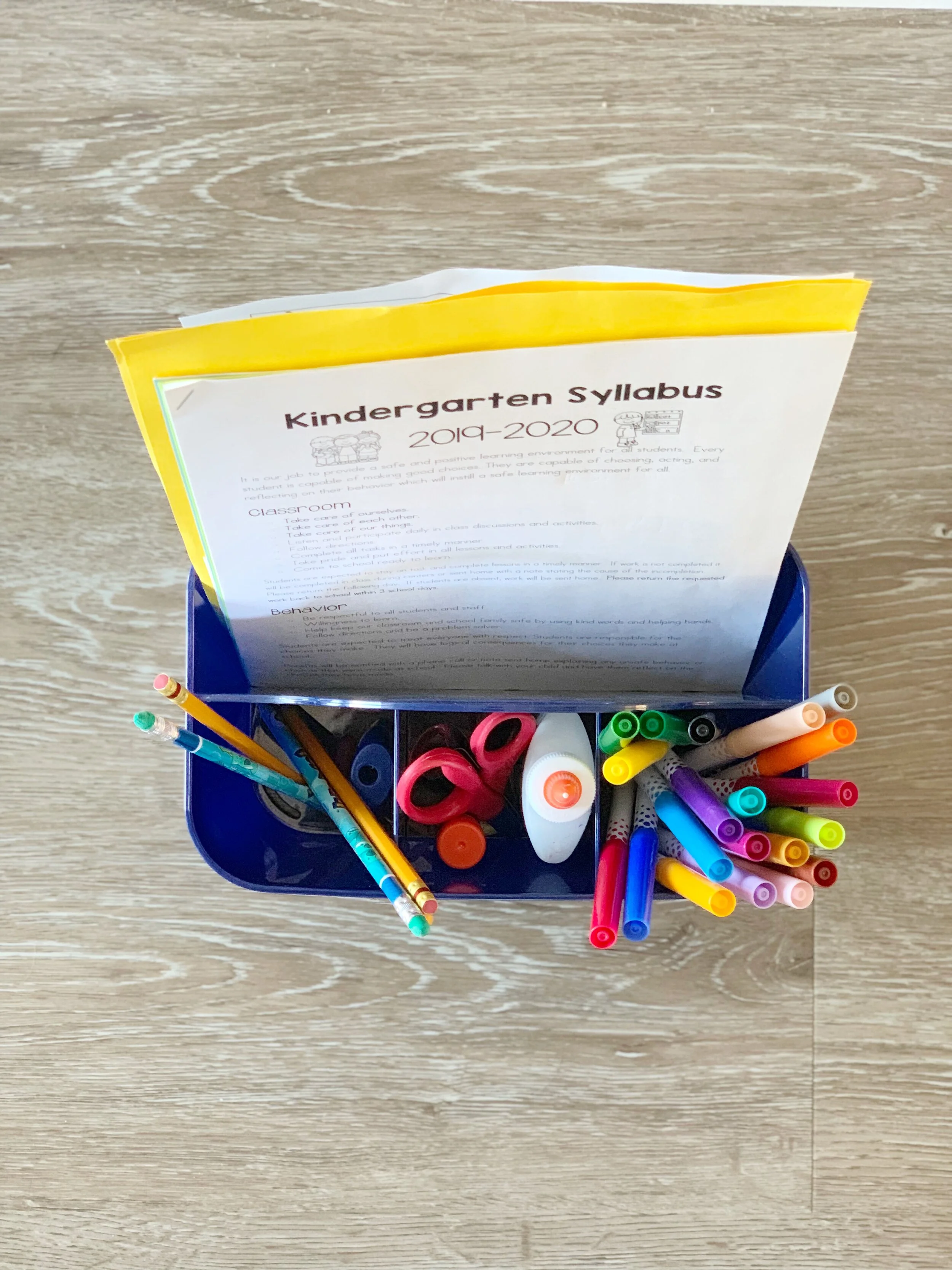 It has one large compartment that is the perfect size for all of the important papers that come home and 3 smaller compartments which I divided into 1. All things pencils, 2. All things Crafting, 3. All things Coloring. Having this as our homework + school hub this year has been a lifesaver!